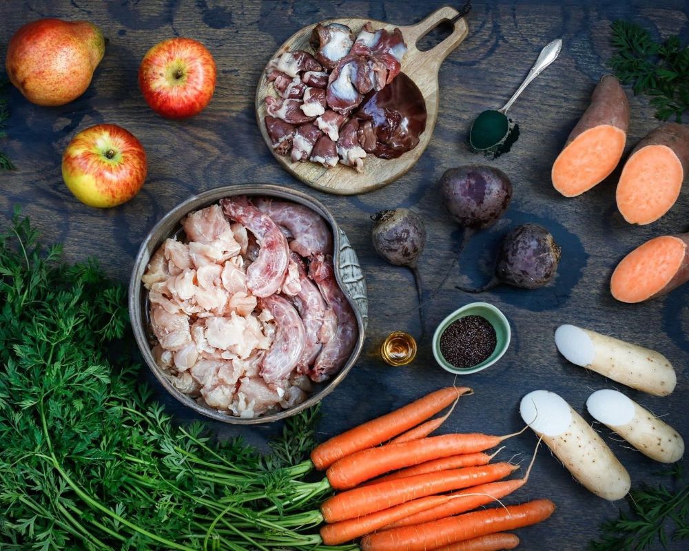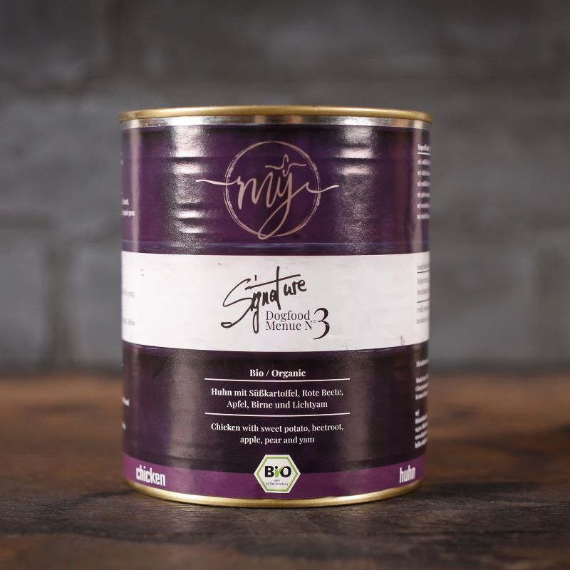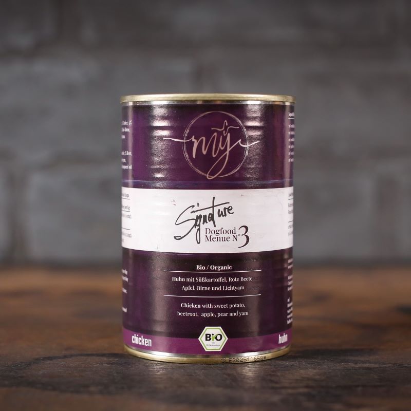 75% Fleisch vom Bio-Huhn, davon 40% feinste Bio-Hühnerbrust, 15% Bio-Hühnermägen, 10% Bio-Hühnerhälse, 10% Innereien vom Bio-Huhn ( Leber, Herz),