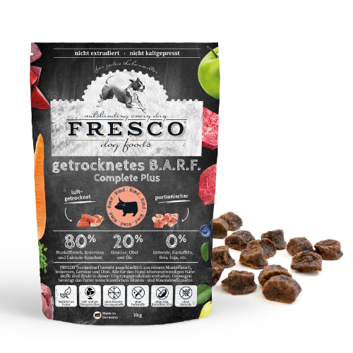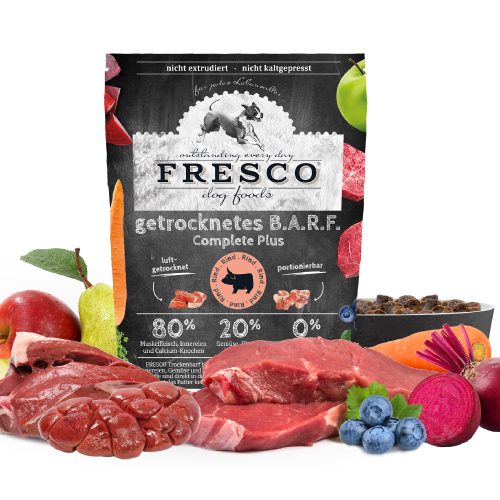 Der Herstellungsprozess von FRESCO getrocknetem B.A.R.F. unterscheidet sich von allen herkömmlichen „Premium“ Trockenfutter. Anstatt die Inhaltsstoffe unter hohem Druck und hohen Temperaturen zu extrudieren (Schnellkochtopf), werden diese aufwendig luft- und gefriergetrocknet. Zur Produktion von 1kg Trockenbarf verwenden wir bis zu 4kg Complete Plus Fertigbarf, da durch die Trocknung die Feuchtigkeit fast vollständig entzogen wird. Bei unserem schonenden Trocknungsprozess bleiben die lebensnotwendigen Nährstoffe aus den Ursprungszutaten erhalten.