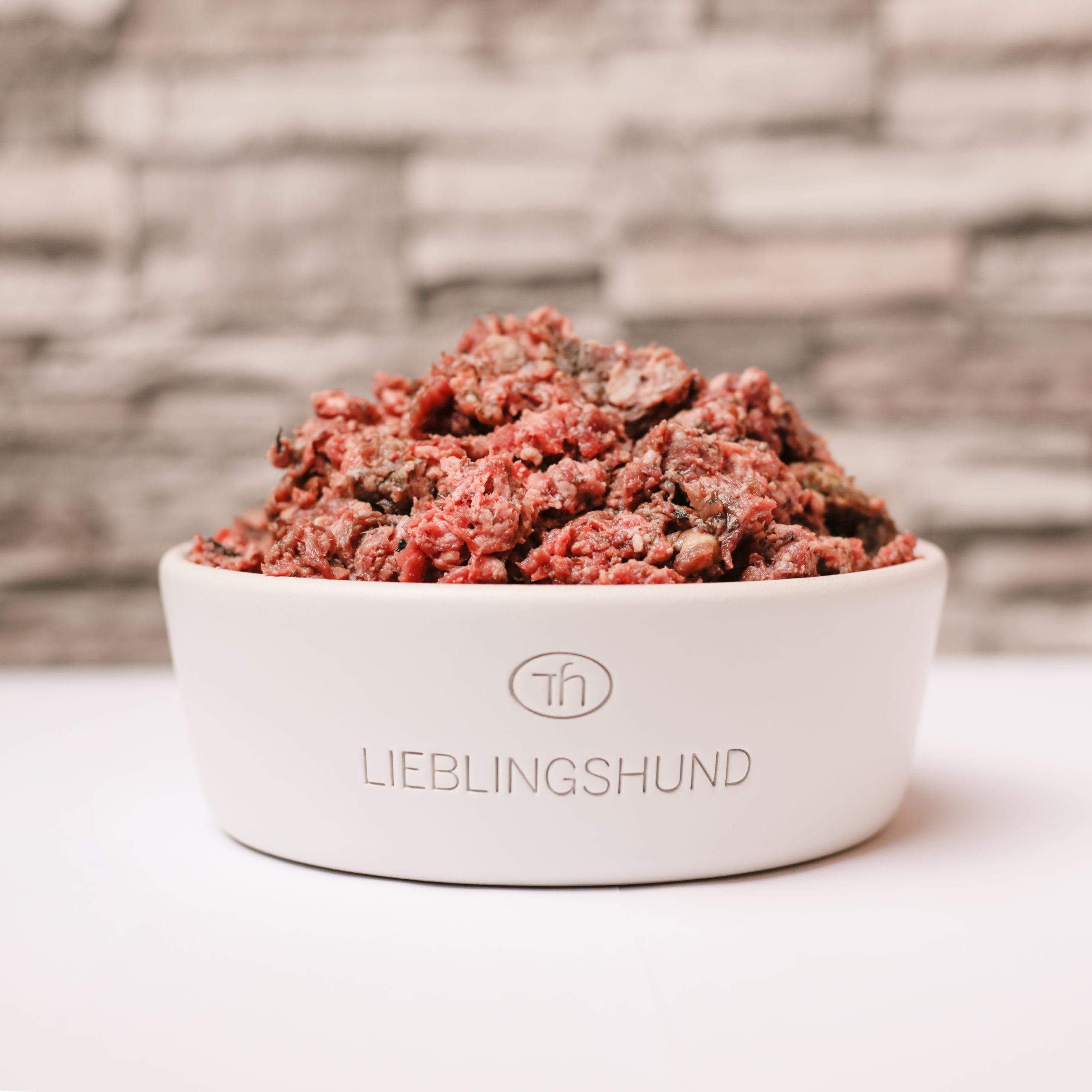 | Fütterungsempfehlung | Faustregel: 2-3% des Körpergewichts des erwachsenen Hundes, bei Welpen und Junghunden kann der Bedarf deutlich höher sein, hier gelten ca. 5-6% des Körpergewichts als Richtwert. Die Fütterungsmenge muss auf individuelle Gegebenheiten (Aktivität, Alter, Rasse etc.) und Bedürfnisse deines Lieblings angepasst werden! Am Wichtigsten ist, dass die Figur des Hundes stimmt, die Rippen müssen deutlich spürbar, jedoch nicht sichtbar sein. |