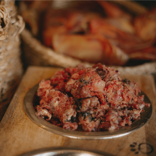 Eine Mischung aus überwiegend Rind, angereichert mit Geflügelknochen. Gerade für Hunde im Wachstum ist das richtige Futter essentiell für den Aufbau gesunder Knochen und Zähne. Um diesen Mehrbedarf an Kalzium zu decken, haben wir das Menü angereichert mit gewolften Geflügelknochen.