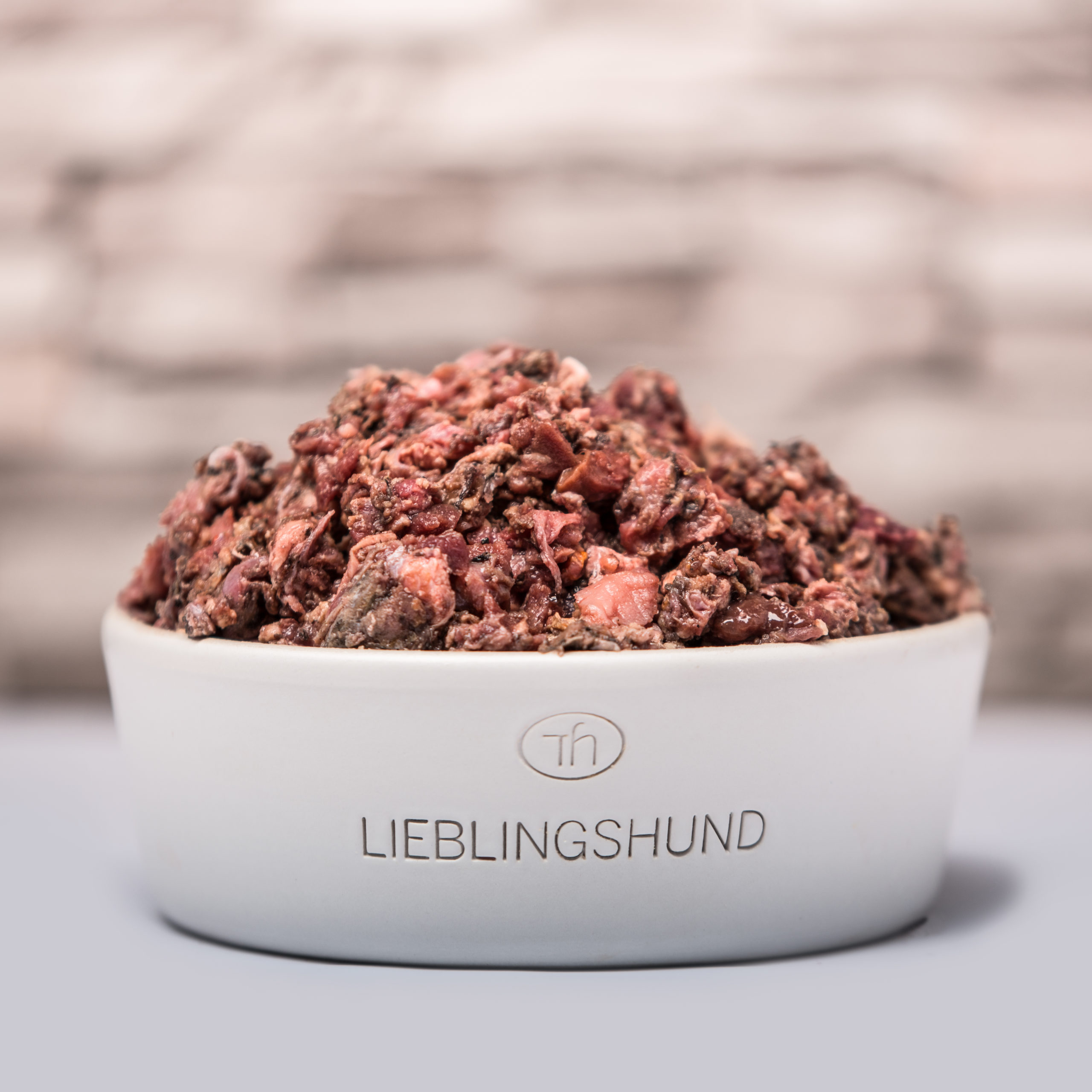 | Fütterungsempfehlung | Faustregel: 2-3% des Körpergewichts des erwachsenen Hundes, bei Welpen und Junghunden kann der Bedarf deutlich höher sein, hier gelten ca. 5-6% des Körpergewichts als Richtwert. Die Fütterungsmenge muss auf individuelle Gegebenheiten (Aktivität, Alter, Rasse etc.) und Bedürfnisse deines Lieblings angepasst werden! Am Wichtigsten ist, dass die Figur des Hundes stimmt, die Rippen müssen deutlich spürbar, jedoch nicht sichtbar sein. |