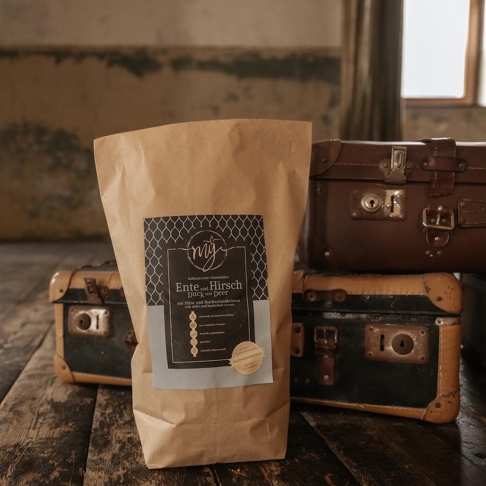 Zusammensetzung: mindestens 40,2% getrocknete Ente und Hirsch (Muskelfleisch, Herz, Leber gewolft, getrocknet und gemahlen), 20% Hirse, 10% Kürbis, Karotten, Johannisbeeren, Ackerschachtelhalm, Löwenzahn, Brennnessel