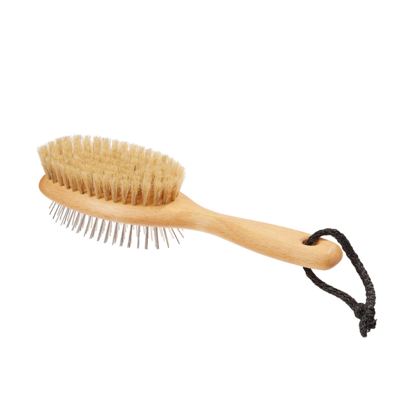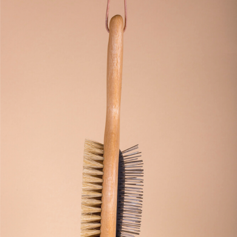 Unsere DOPPELSEITIGE HUNDEBÜRSTE aus geöltem Buchenholz ist mit ihren zwei unterschiedlichen Seiten optimal für die Pflege unterschiedlicher Felltypen geeignet: Die abgerundeten Metallstifte gleiten mühelos durch langes, dichtes Haar und entwirren Knötchen ohne zu ziepen. Die Naturborsten vom Schwein entfernen zuverlässig Staub und bringen kurzes wie langes Fell zum Glänzen. Vor allem während des Fellwechsels und bei erhöhter Belastung durch Pollen und Feinstaub ist eine sorgsame Fellpflege unerlässlich. Mit der Kordel am Griff kann die Bürste ganz einfach zur Leine an die Garderobe gehängt werden. So ist sie für eine schnelle Reinigung nach dem Spaziergang sofort zur Hand.