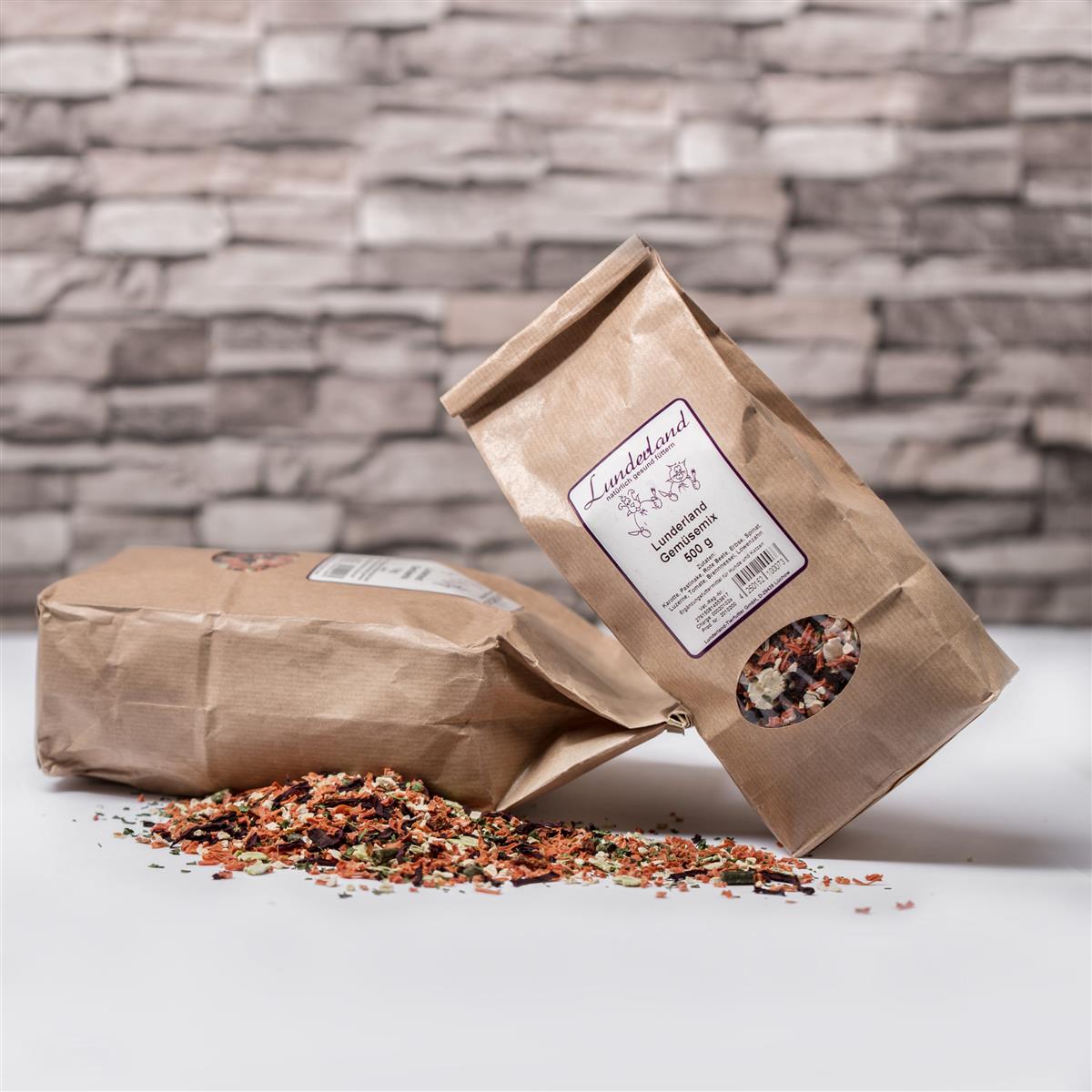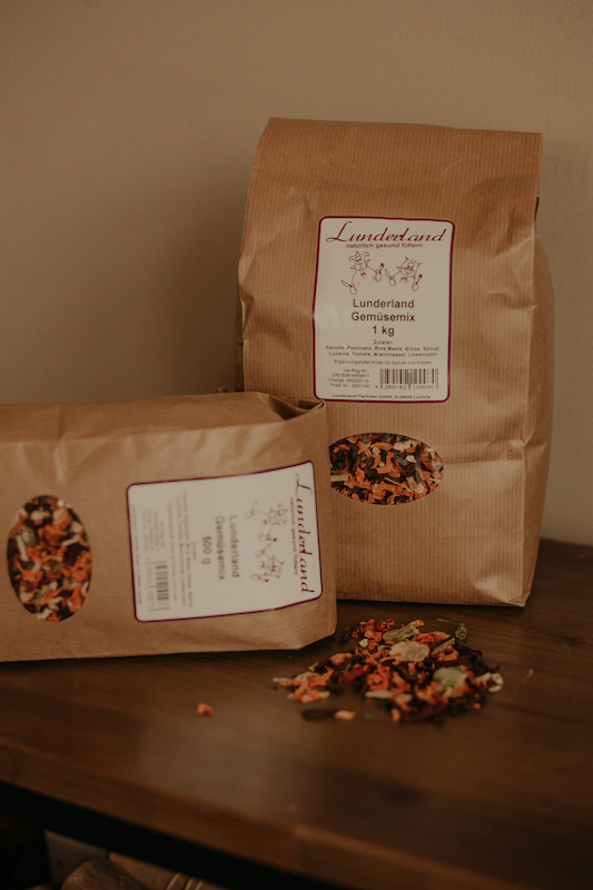 Unser getrockneter Gemüsemix ist eine gesunde Abwechslung zum frischen Gemüse in der Rohfleischfütterung, wenn es z.B. mal schnell gehen muss oder Platz im Froster für gefrorenes Fleisch gespart werden soll.