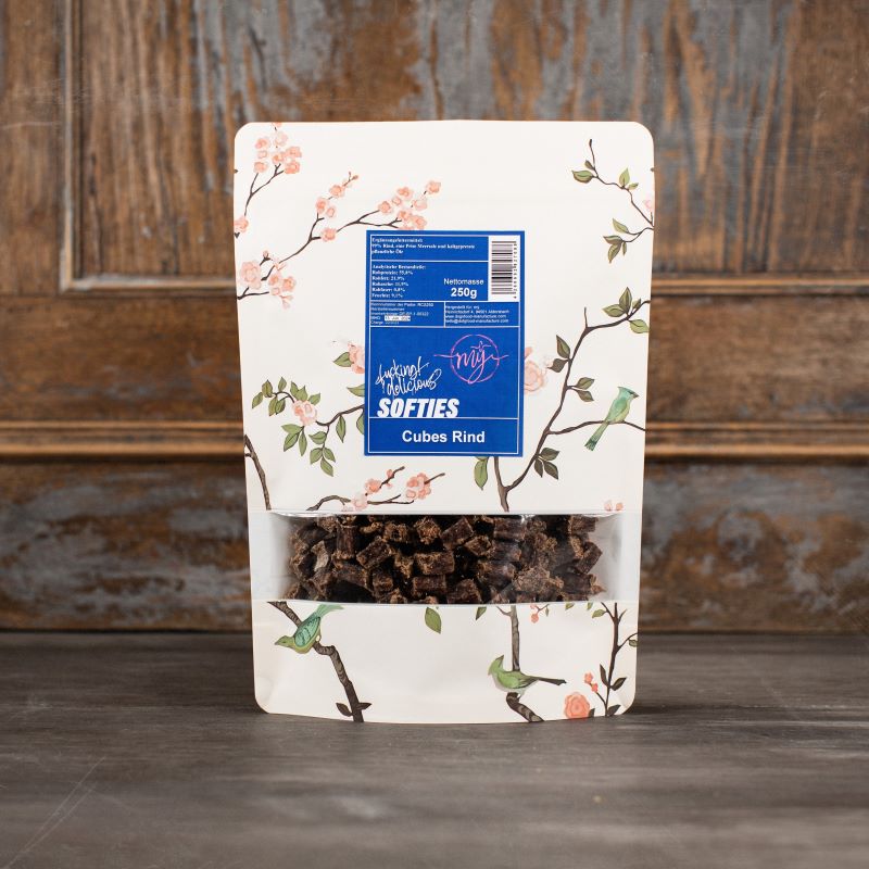 99% Rind, eine Prise Meersalz und kaltgepresste pflanzliche Öle machen aus dem Cube einen soften Snack mit hoher Akzetpanz fürs Training und für die besondere Belohnung zwischendurch.