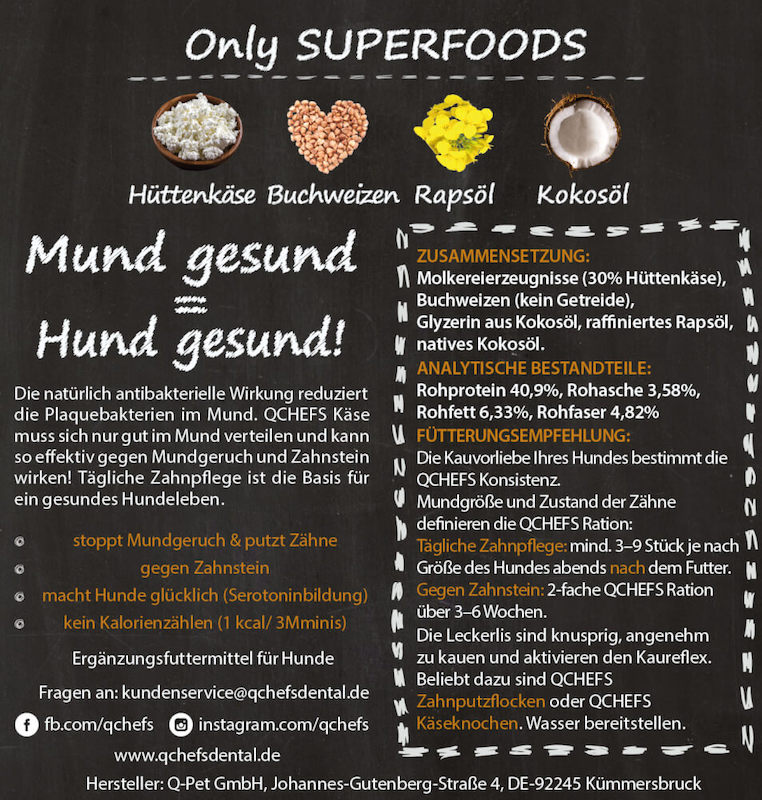 🦷 Mund gesund = Hund gesund! Die natürlich antibakterielle Wirkung reduziert die Plaquebakterien im Mund. QCHEFS Käse muss sich nur gut im Maul verteilen und kann so effektiv gegen Mundgeruch und Zahnstein wirken! Tägliche Zahnpflege ist die Basis für ein gesundes Hundeleben.