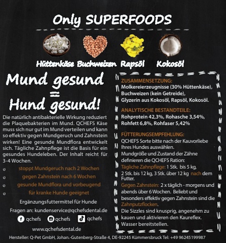 🦷 Nach neuer Wissenschaft: Bei QCHEFS ist der Hüttenkäse der Wirkstoff. Er hat einen Peptidkomplex – der sich an den Zellwänden der Bakterien anlagert. So können sie sich nicht mehr vermehren. Der Mundgeruch geht weg und der Zahnstein löst sich. Dies wird von dem besonderen Zusammenwirken der Inhaltsstoffe unterstützt. So ist für eine sehr gute Mundhygiene, Gesundsein und fürs Wohlfühlen gesorgt.