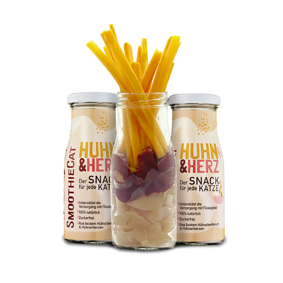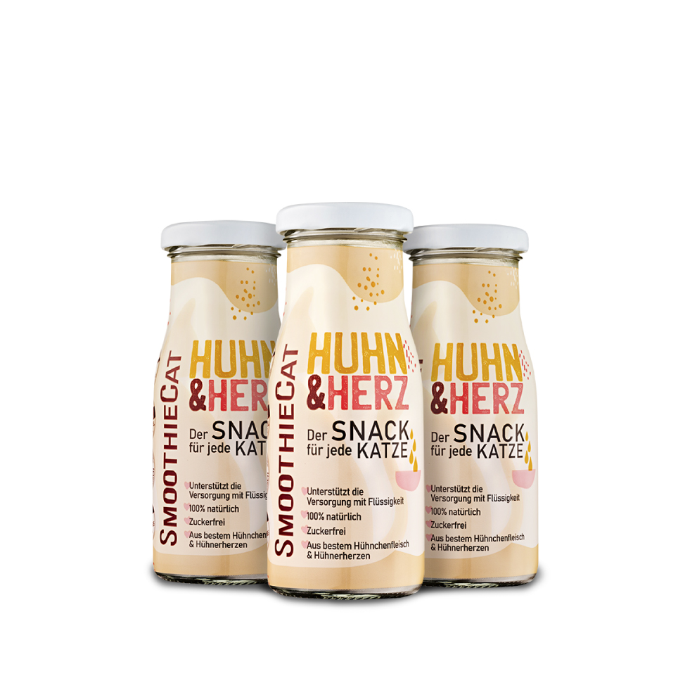 SmoothieCat ist der fleischige Smoothie für Katzen aus Hühnchenfleisch und Hühnerherzen. Geflügel überzeugt in der Ernährung von Katzen mit vielen Vorteilen: Es ist sehr mager, leicht zu verdauen und hat hervorragende Nährwerte, die zur gesunden Körperfunktion einer Katze beitragen. Hühnerherzen zählen zu Innereien aber auch zum Muskelfleisch denn Hühnerherzen sind letztlich reines Muskelfleisch. Mit einem geringen Fettanteil und dem enthaltenen Taurin sind sie für Katzen ein delikater und auch wichtiger Leckerbissen. Die gekochten und pürierten Karotten mögen Katzen im Geschmack meist sehr gerne und werden so mit Carotin, Vitamin E, Vitamin B6, B12 und B2 versorgt und das Immunsystem gestärkt. Möhren wirken antioxidativ gegen freie Radikale, die für krebsverursachende Zellschäden bekannt sind. Durch ihren Reichtum an Ballaststoffen kurbeln Karotten die Verdauung an und tragen zu einer funktionierenden Darmtätigkeit unserer Samtpfoten bei.
