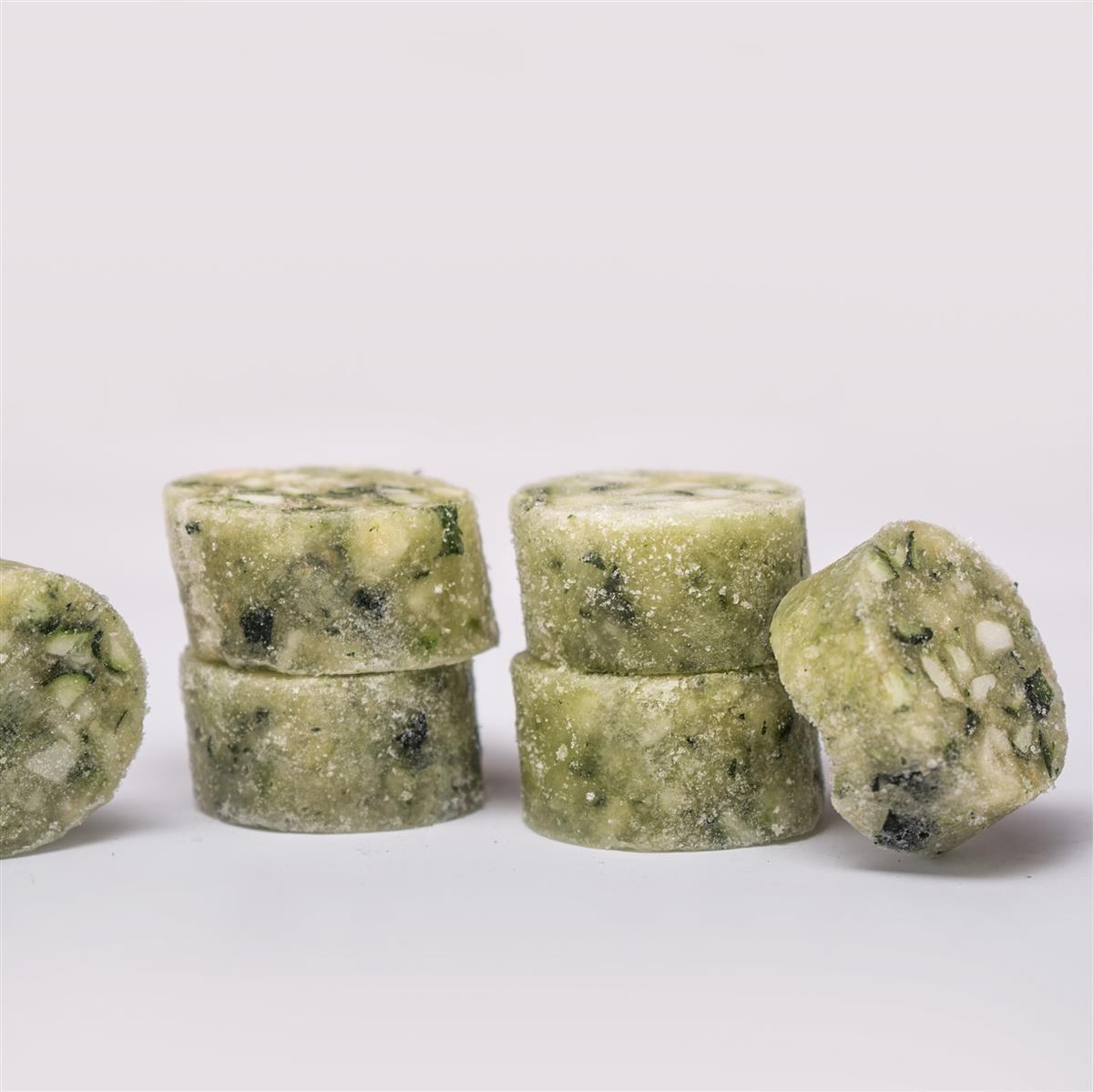 Das fein pürierte Obst & Gemüse liefert Ballaststoffe, Rohfaser und sekundäre Pflanzenstoffe für die Verdauung. Die ideale Ergänzung zu unserem Rohfleisch oder den Fleischdosen. Einfach und schnell zubereitet: das Fleisch in den Napf geben und mit einer Gabel die Gemüsemischung ordentlich durchmengen, fertig! Das Gemüse ist zerkleinert, eingefroren, in Taler gesägt, in einem Beutel verpackt und dadurch absolut super zu portionieren.